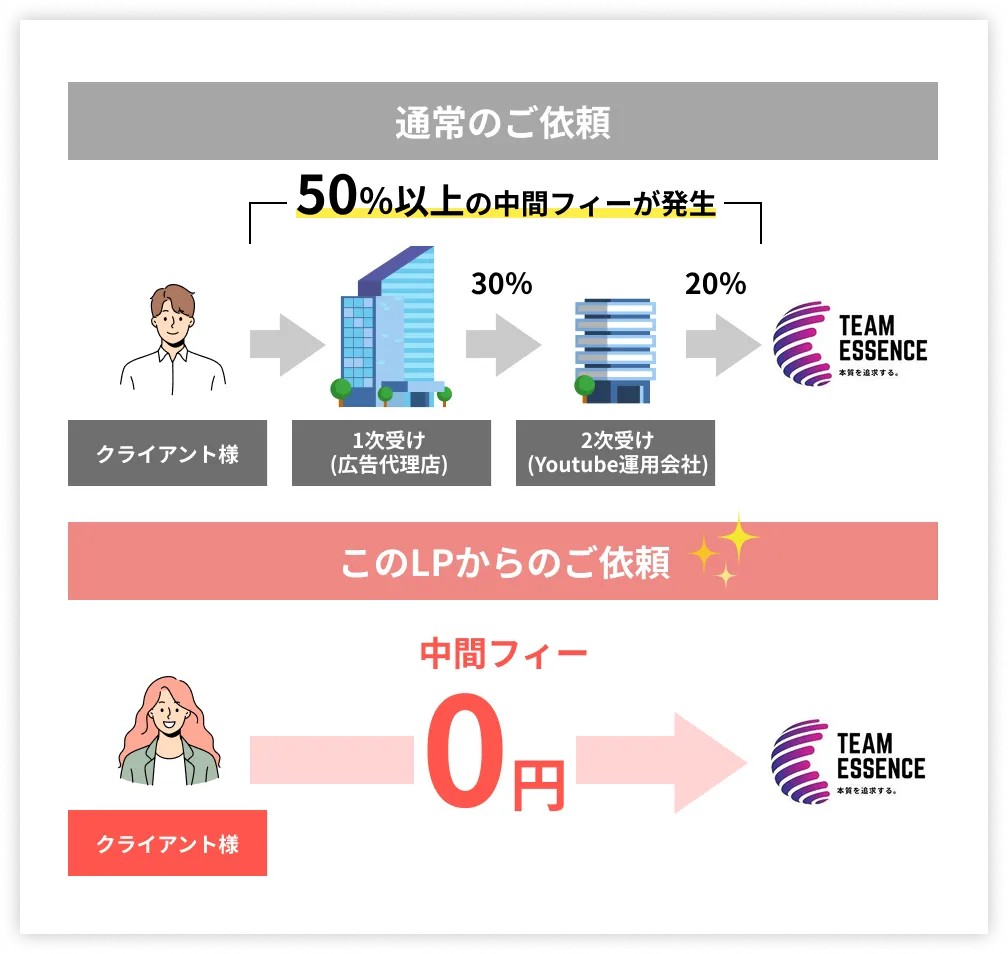 多くの制作会社では代理店を含め1次受け、2次受けと間が挟まることで中間フィーが発生しています。ESSENCEでは自社完結なので無駄な費用が一切かかりません。